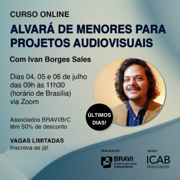Notícias | 6 de junho de 2023 Curso “Alvará de Menores para Projetos Audiovisuais”, com Ivan Borges Sales Curso “Alvará de Menores para Projetos Audiovisuais”, com Ivan Borges Sales 1414/06/2023 O curso “Alvará de menores para projetos audiovisuais” pretende apresentar para produtores, diretores de elenco, coordenadores de produção, agentes...